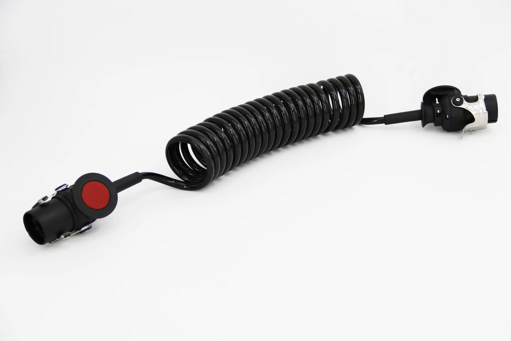 Configuration: Seven-core coiled spiral cable with copper conductors and flexible outer insulation for tractor-to-trailer connections.